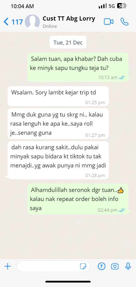 “Saya ada masalah ligamen lutut lepas eksiden 2 tahun lepas. Lepas amalkan Minyak Sapu Tungku Teja ni Alhamdulillah semakin baik.”